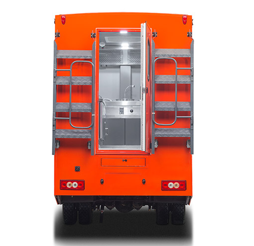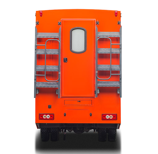 四輪驅動、動力轉向、排氣制動、斷氣制動、可調方向盤、空調、多媒體音響、ABS制動行駛記錄儀兼北斗系統(tǒng)接口、遙控中控鎖、電動玻璃升降器、車身噴涂防火標識、雙側液壓電動展開。